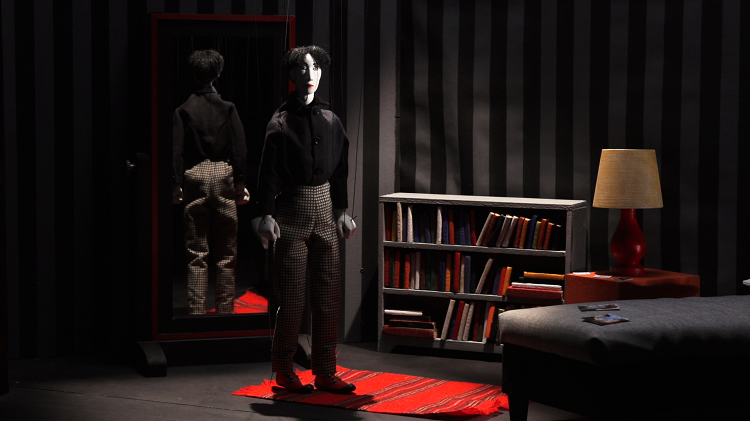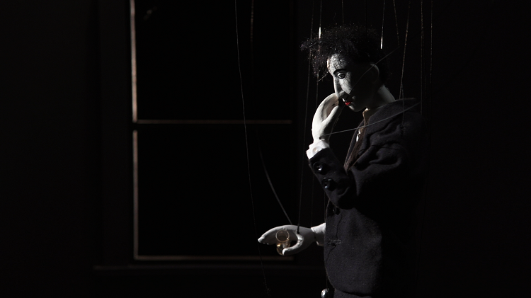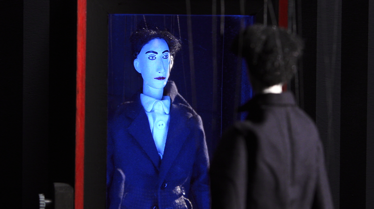 We are telling the story in the form of a puppet show, with Peter playing the part of puppeteer and narrator. Making the marionettes has been a challenge for me. While I have often used puppets as subject matter, building working puppets presents a very different set of problems. Peter's script called for some tricky stuff : a bicycling scene, a spaghetti supper, and a scene where one puppet's reflection morphs into another's. Although we're using film, I wanted to stay true to the form of a puppet show and not rely on editing to make a scene work. I have renewed respect for puppeteers, who have always been an inspiration to me!