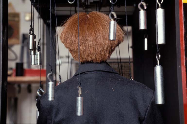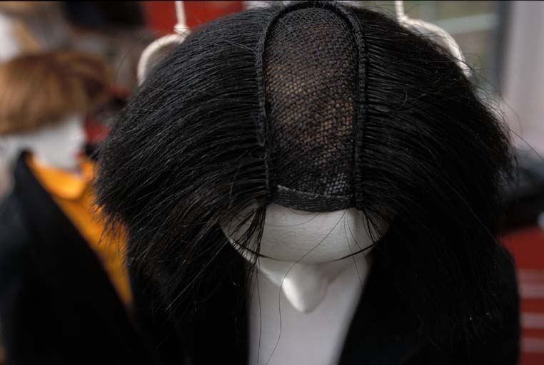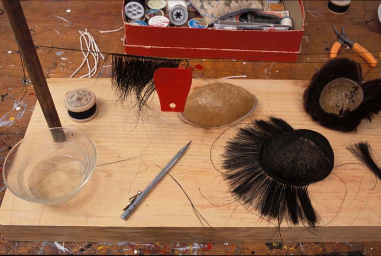 This is my wigmaking apparatus. Strands of hair are strung into a fringe.